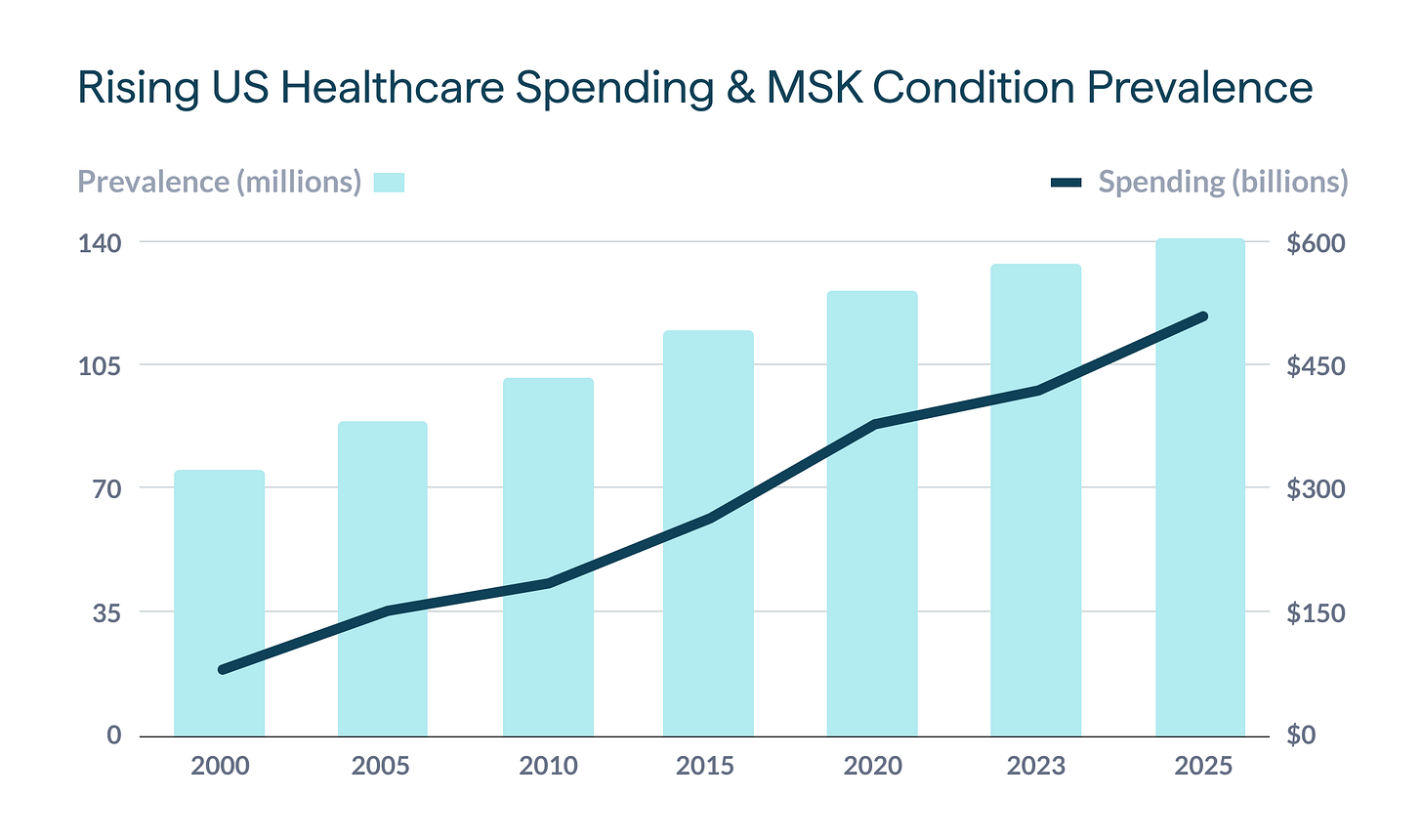 Chart: Prevalence of Musculoskeletal Conditions and Associated Healthcare Spending in the United States, 2000-2025. Data compiled from multiple sources: United States Bone and Joint Initiative (2016, 2020); Cleveland Clinic Global Burden of Disease Analysis (2022); Evernorth MSK Total Cost of Care Report (2023). 2025 and years without published data points represent interpolated estimates based on reported growth trends.